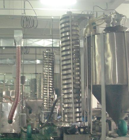 老式的垂直振動提升機是一種偏心彈性連桿結構驅動的單質體提升機,其是用電機通過皮帶輪傳動,帶動偏心連桿機構,推動螺旋槽體使其沿著與螺旋槽底成一定角度的方向做往復振動。槽體的物料,在振動中被加速大一定數值時即做拋擲運動,而后掉回輸送槽內再被拋起,如此不斷先前上方跳躍,以達到向上輸送的目的。而新型振動垂直提升機是采用雙振動電機作為激振源來對舊式的連桿機構進行替代,結構相對簡單,但操作維護更加方便,且占地空間更小,更容易和其他設備配套使用。